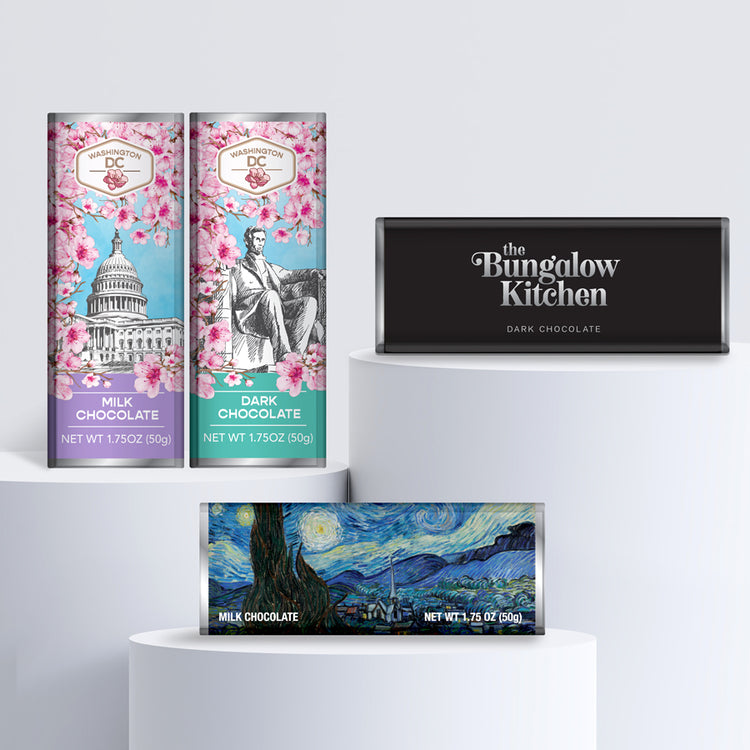 Milk Chocolate 1.75oz Bar - Nutrition Facts Servings: 1, Serv. Size 1 Bar (50g), Amount Per Serving: Calories 260, Total Fat 15g (23% DV), Saturated Fat 9.2g (46% DV), Trans Fat 0g, Cholest. 10mg (3% DV), Sodium 30mg (1% DV), Total Carb. 29g (10% DV), Fiber 1g (4% DV), Total Sugars 28g (Incl. 25g Added Sugars, 50% DV), Protein 3g, Vit. D (0% DV), Calcium (8% DV), Iron (6% DV), Potas. (4% DV). Dark Chocolate 1.75oz Bar - Nutrition Facts Servings: 1, Serv. Size 1 Bar (50g), Amount Per Serving: Calories 270, Total Fat 17g (26% DV), Saturated Fat 10.1g (51% DV), Trans Fat 0g, Cholest. 0mg (0% DV), Sodium 0mg (0% DV), Total Carb. 25g (8% DV), Fiber 4g (16% DV), Total Sugars 23g (Incl. 23g Added Sugars, 46% DV), Protein 3g, Vit. D (0% DV), Calcium (2% DV), Iron (30% DV), Potas. (6% DV).